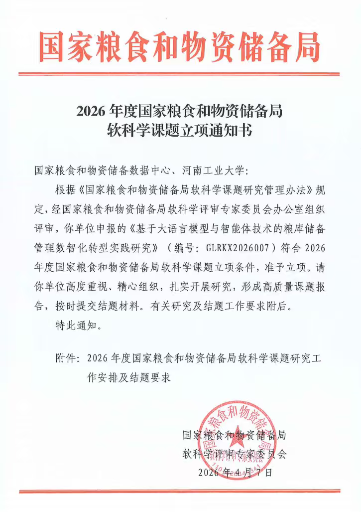 申报的《基于大语言模型与智能体技术的粮库储备管理数智化转型实践研究》课题(课题编号:GLRKX2026007)成功获批立项。此次立项是我校深入贯彻国家粮食安全战略,推动粮食储备管理数智化转型的重要科研突破,充分彰显了学校在粮食行业信息化领域的深厚积淀与创新能力。