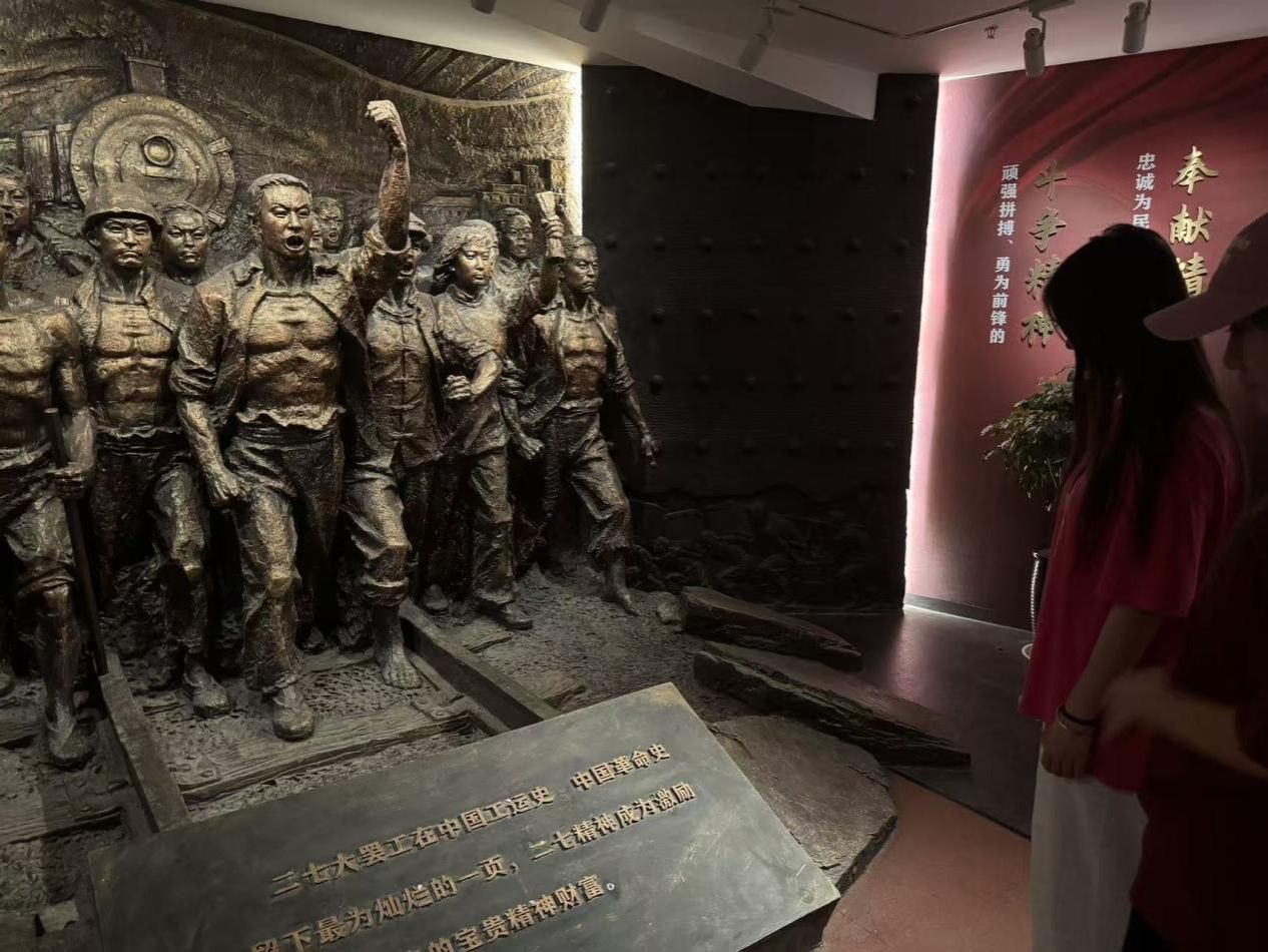 8月27日上午,实践团前往二七纪念馆开展深度参观学习。二七纪念馆作为系统展示二七革命历史的重要场所,馆藏丰富、史料详实。在纪念馆工作人员的引导下,实践团成员沿着“铁路风云”“罢工壮举”“精神传承”等展区有序参观,通过场景复原、多媒体演示等形式,沉浸式体验了京汉铁路工人大罢工从酝酿、爆发到后续影响的完整历程。期间,纪念馆副馆长李娜与实践团成员进行交流,她结合馆内珍藏的罢工工人书信、当年使用的工具等文物,生动讲述了革命先辈在艰难环境下坚守信仰、团结奋斗的故事,并鼓励青年学子要从历史中汲取力量,将个人成长与国家发展紧密结合。实践团成员认真记录讲解内容,积极提出关于历史细节、红色精神当代价值的问题,现场学习氛围浓厚。