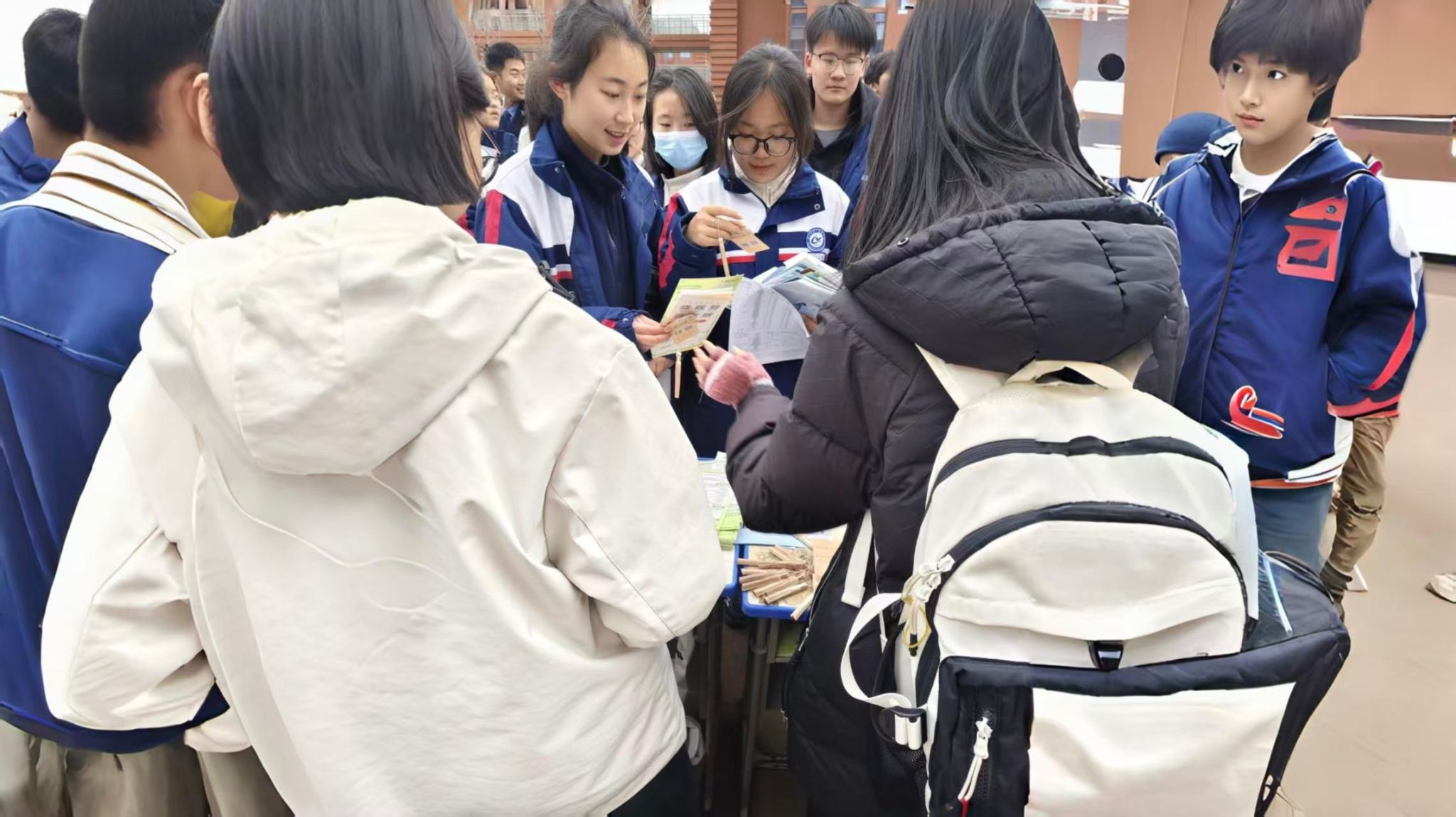 在商丘市第一高级中学校园内,实践团队设立了招生咨询摊位。团队成员热情地向过往学生及家长发放招生简章,详细介绍av影片