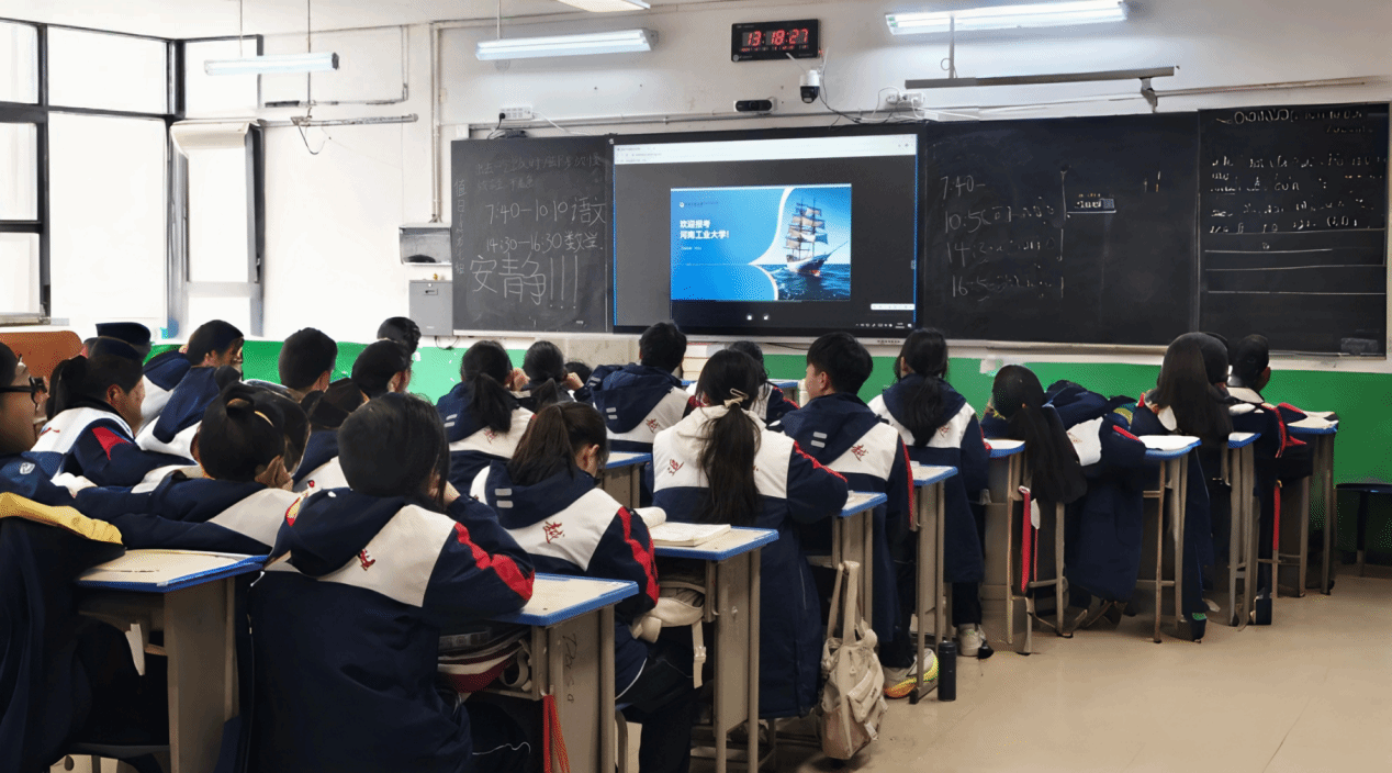互动环节中,高一34班学生就科研竞赛参与、考研就业方向、校园生活细节等话题踊跃提问。有学生询问"计算机专业需要怎样的数学基础",团队成员孙露涵结合高等数学、线性代数等课程的实际应用进行解答,说明基础数学与专业编程的关联性。另有学生关心"大学社团活动与学业如何平衡",团队成员以自身参与学生会与学科竞赛的经历为例,说明时间规划的重要性。现场交流持续约30分钟,气氛热烈。