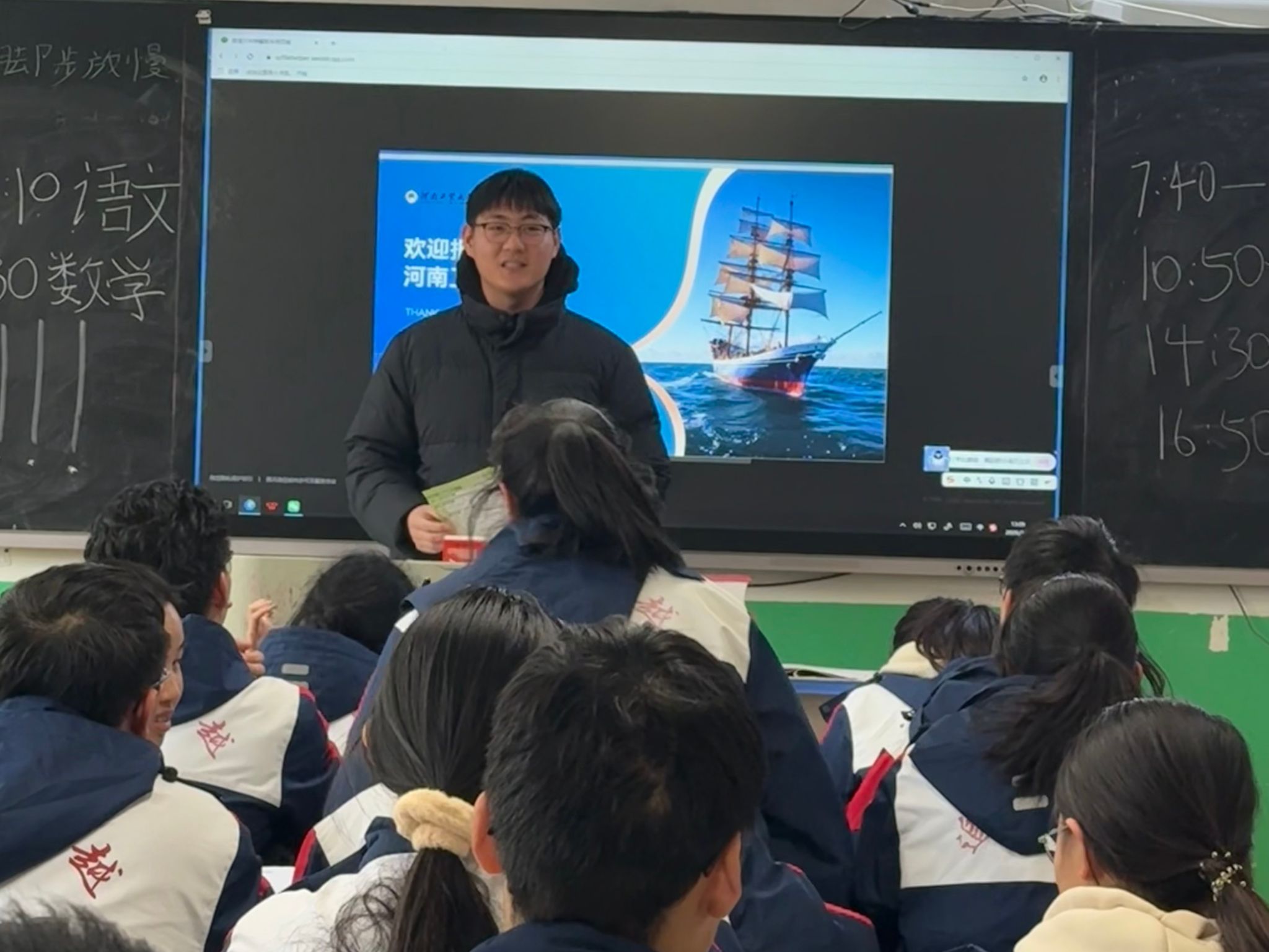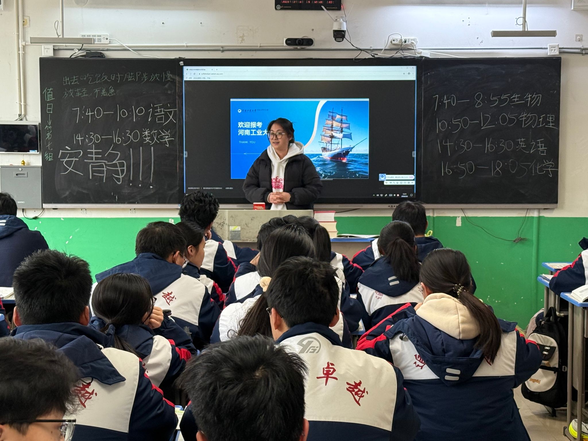 由于学校现场信号不佳,原定的 PPT 展示未能顺利进行,且受下午考试时间限制,宣讲团及时调整入班宣讲策略,以 “口述 + 纸质资料辅助” 的形式在下午1时走进高一 34 班开展深度宣讲。宣讲过程中,成员们条理清晰地从学校交通便利度展开介绍,详细说明校园紧邻地铁线路的地理优势,让同学们清晰了解出行便捷性;随后聚焦学校的特色专业例如粮食工程、电子信息工程等专业为同学们展开讲解;针对转专业这一热门话题,成员们结合学校最新政策,明确讲解申请时间节点、考核标准,消除同学们对 “专业选择失误” 的担忧;在学生扶助方面,介绍国家奖学金、校级助学金、勤工助学岗位等多元帮扶渠道,让同学们充分知晓学校对家庭经济困难学生的关怀与支持。尽管缺少 PPT 辅助,宣讲团成员凭借扎实的准备与清晰的表达,依然让宣讲内容极具吸引力,同学们专注聆听,不时举手提出疑问,现场互动氛围热烈有序。